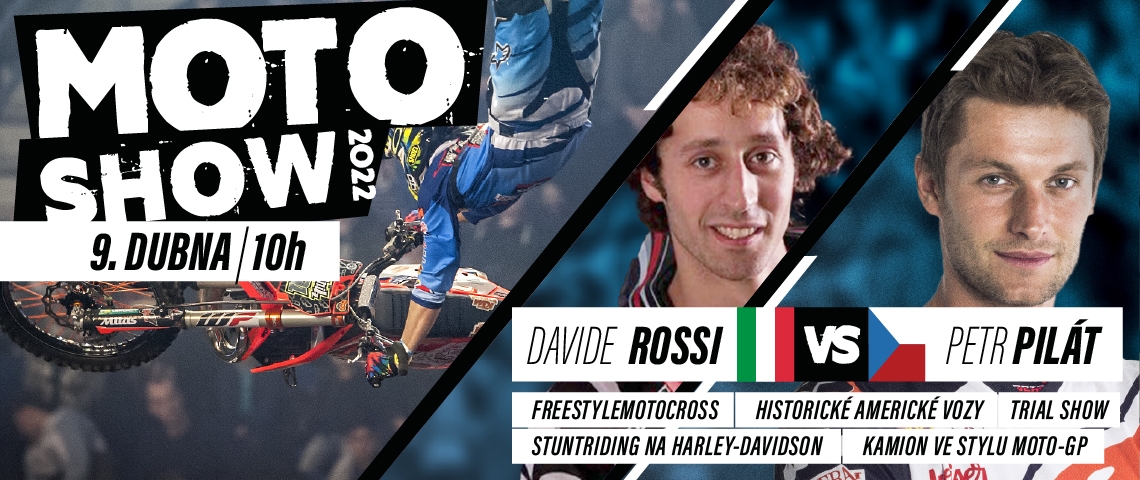 Tradiční a adrenalinová Motoshow se na parkovišti před NC Borská pole uskuteční v sobotu 9. dubna 2022. Diváci se mohou těšit hlavně na souboj ve freestyle motocrossu, který nabídne mezinárodní měření sil. S českou legendou Petrem Pilátem se o přízeň diváků bude prát jeden z aktuálně nejlepších italských jezdců Davide Rossi.