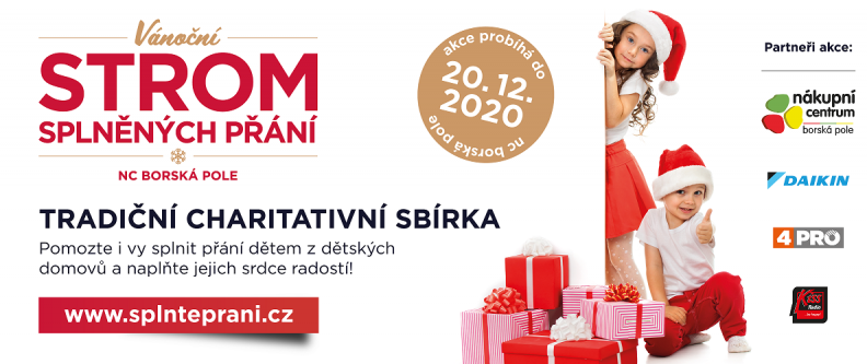 Až do 20. prosince bude v NC Borská pole vánoční strom s hosteskami, které pomáhají s výběrem. V seznamu v Nákupním centru Borská pole najdete vánoční přáníčka dětí z dětských domovů. Dárky jsou opravdu různé, a je jen na Vás, který si vyberete. Až najdete svého favorita, vyzvednete si u hostesek kartičku s dárkem i jménem dítěte. Po zakoupení vánočního balíčku už ho stačí pouze odnést k vánočnímu stromku hosteskám, které dárek zabalí a označí. Vánoční strom splněných přání plní konkrétní přání konkrétním dětem! Jedná se o tradiční a velmi populární sbírku. Seznam nesplněných dárků je k nahlédnutí také na stránkách www.splnteprani.cz.